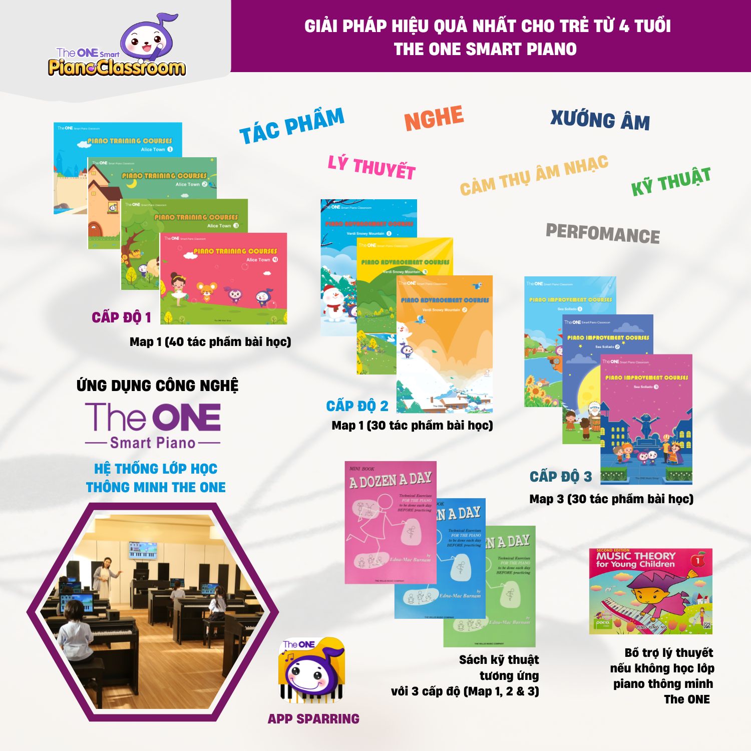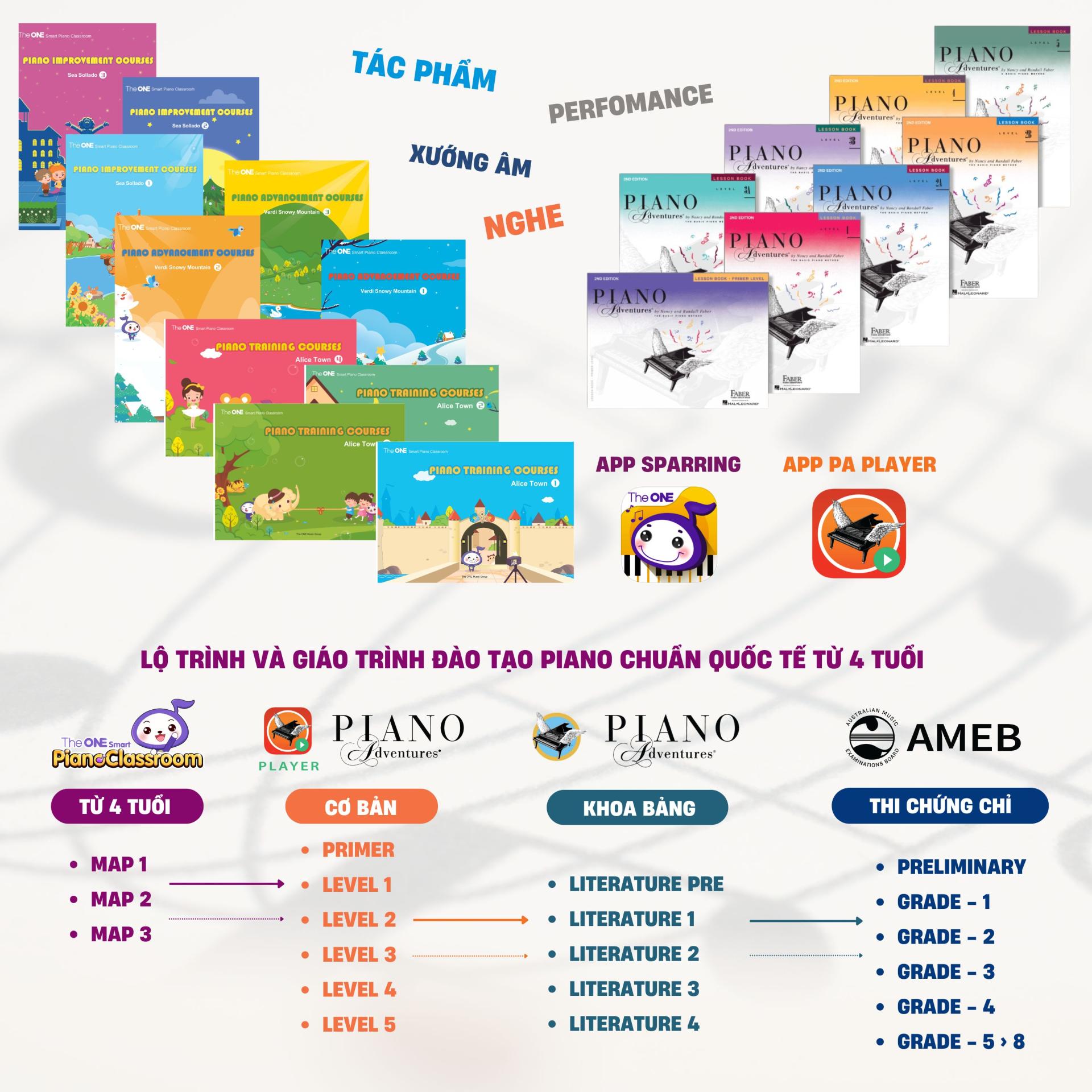 Giáo trình học piano với The ONE Smart Piano bao gồm 100 bài học chia thành 3 cấp độ, kết hợp giữa lý thuyết âm nhạc và công nghệ hiện đại, giúp học viên tiến bộ nhanh chóng từ những bài học cơ bản đến các kỳ thi chứng chỉ quốc tế.
