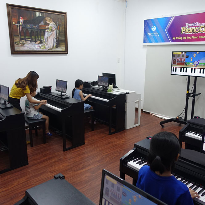Hiển thị bài đàn bằng nốt nhạc: Học viên đàn theo nốt nhạc di động, không nhìn tay, giáo viên liên tục kiểm tra tư thế ngón tay.