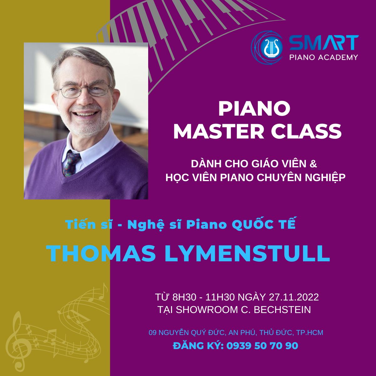 Harmony - School Of Music vinh dự được Tiến sĩ - Nghệ sĩ dương cầm Thomas Lymenstull của Đại học Nam California tổ chức Master Class dành cho giáo viên tâm huyết và học sinh học piano chuyên nghiệp. Ông là một giảng viên tâm huyết, nghệ sĩ nổi tiếng đã giảng dạy và biểu diễn trên khắp Hoa Kỳ, Nhật Bản, Áo, Ý, Đài Loan và Trung Hoa,... với vai trò solo và cùng dàn nhạc.