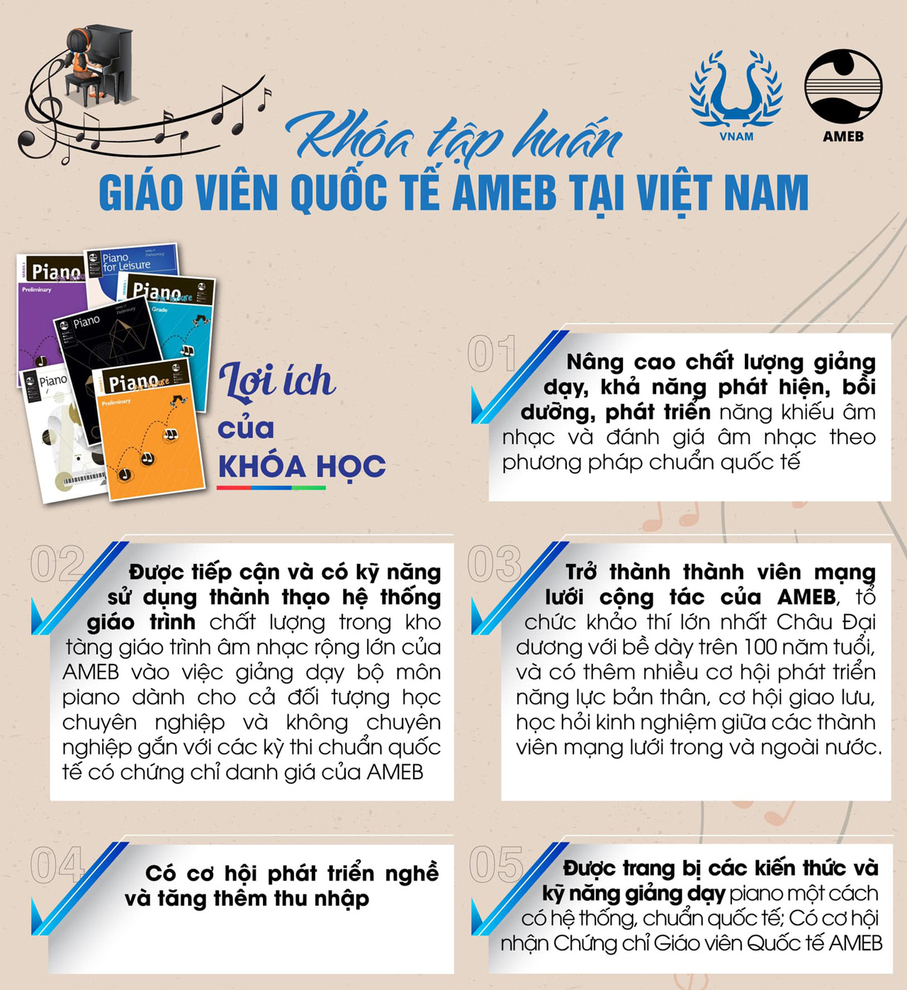 Tiếp nối thành công khóa học đầu tiên và để đáp ứng nhu cầu của Quý Thầy, Cô và các bạn sinh viên, Hội đồng Khảo thí Âm nhạc Quốc gia Australia – AMEB và Học viện Âm nhạc Quốc gia Việt Nam tiếp tục tổ chức Khóa Tập huấn Giáo viên Quốc tế AMEB tại Việt Nam – KHÓA 2 vào tuần đầu tháng 8 năm 2023 tại Hà Nội theo phương thức trực tiếp và online.
