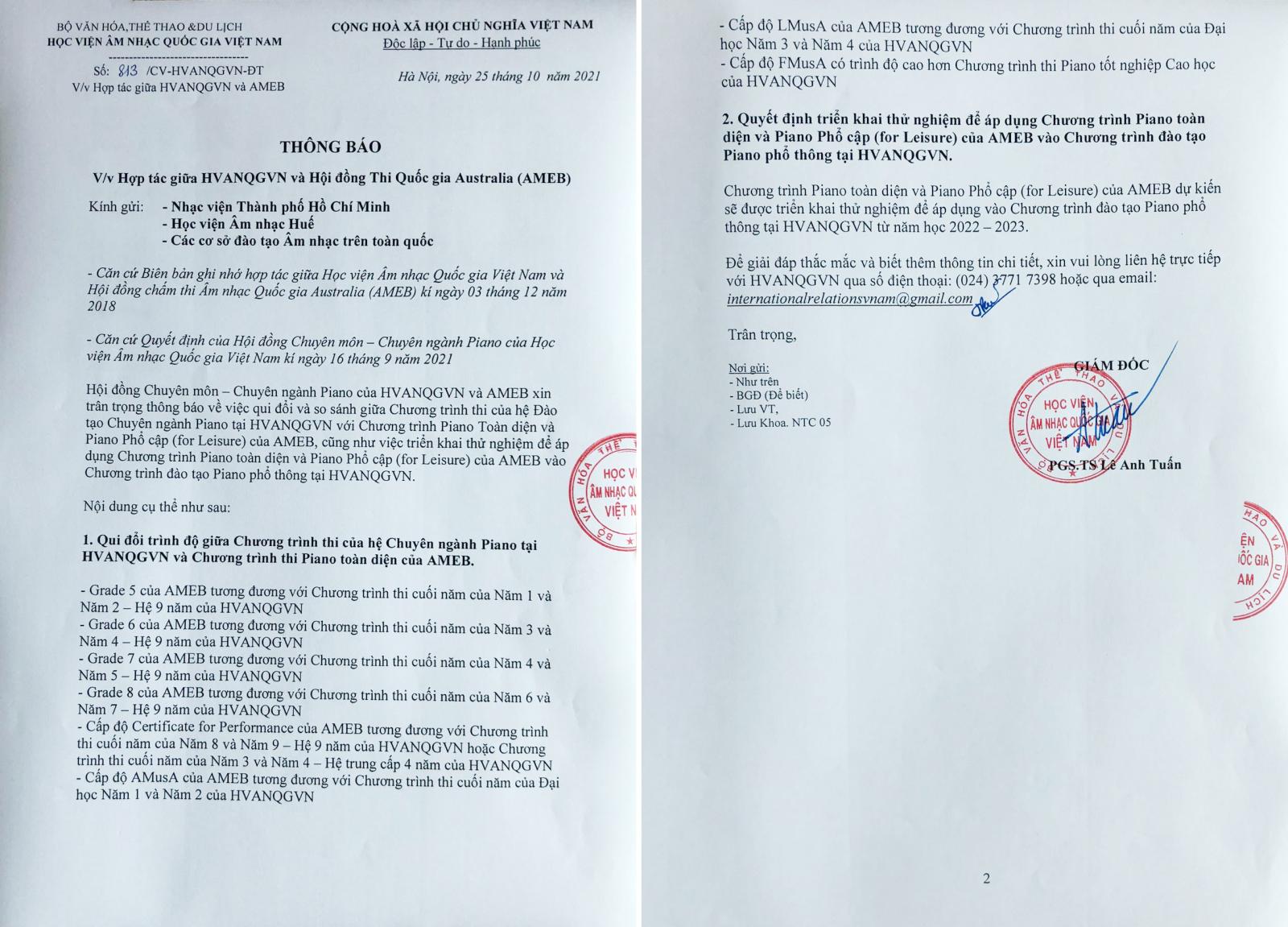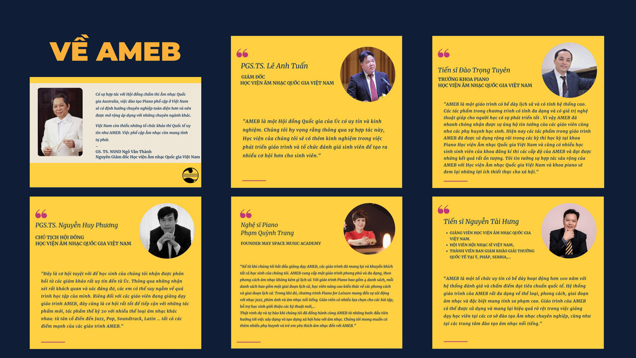 - Uy Tín và Hợp Tác Quốc Tế: Năm 2018, trong kỷ niệm 100 năm thành lập, AMEB đã thiết lập mối quan hệ chặt chẽ và ký thỏa thuận hợp tác phát triển tại Việt Nam như Học viện m nhạc Quốc gia Việt Nam, Nhạc viện Thành phố Hồ Chí Minh, Nhạc viện Huế, Đại học Sư phạm Nghệ thuật Trung ương, Trường Cao đẳng Nghệ thuật Hà Nội cùng với nhiều trường Đại học, Trường âm nhạc và Trung tâm âm nhạc tại các tỉnh thành trên toàn quốc.